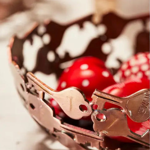 Add a touch of charm and sustainability to your home with this Antique Copper Finish Recycled Iron Key Bowl. Handcrafted from assorted recycled iron keys, this ornamental round bowl showcases both creativity and eco-conscious design.