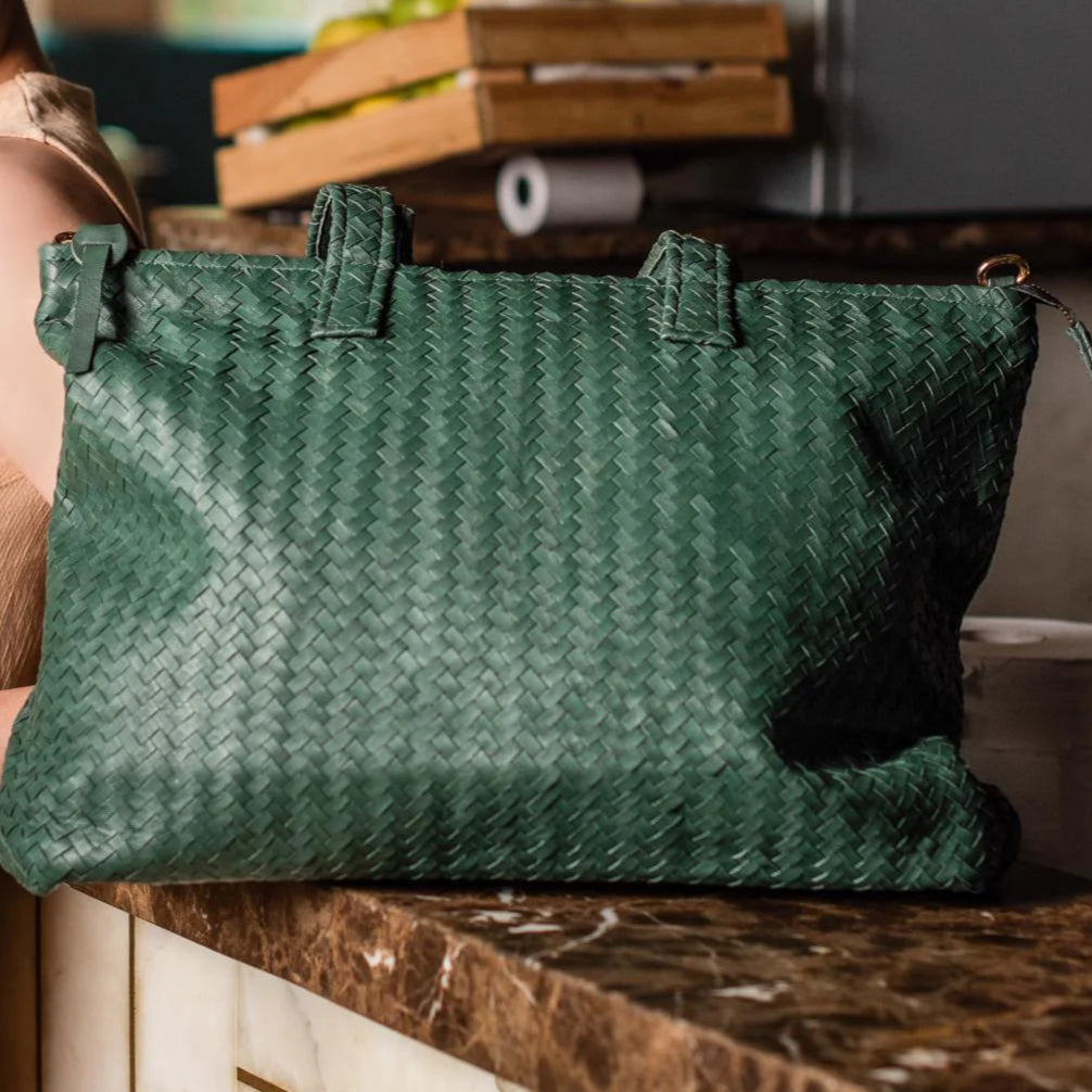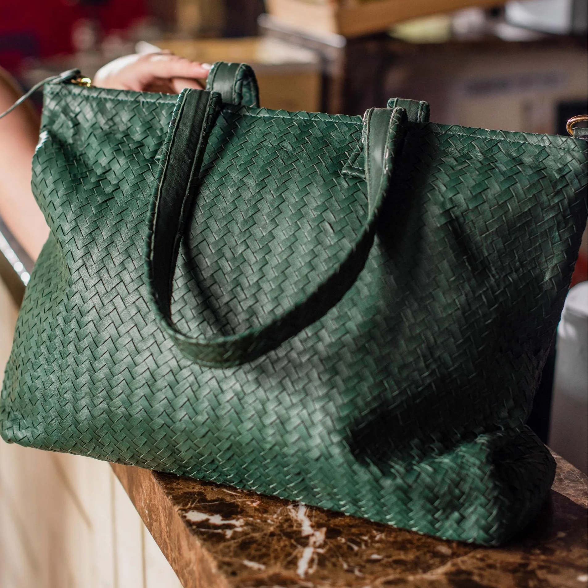 A beautifully crafted woven leather handbag that combines artisanal detail with modern functionality.