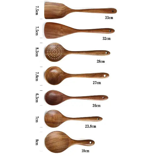 This 7-piece wooden utensil set not only makes cooking easier but also adds warmth and style to your kitchen. Built to last, they are lightweight, durable, and easy to clean—just wipe with a damp cloth and re-oil occasionally to maintain their natural beauty.