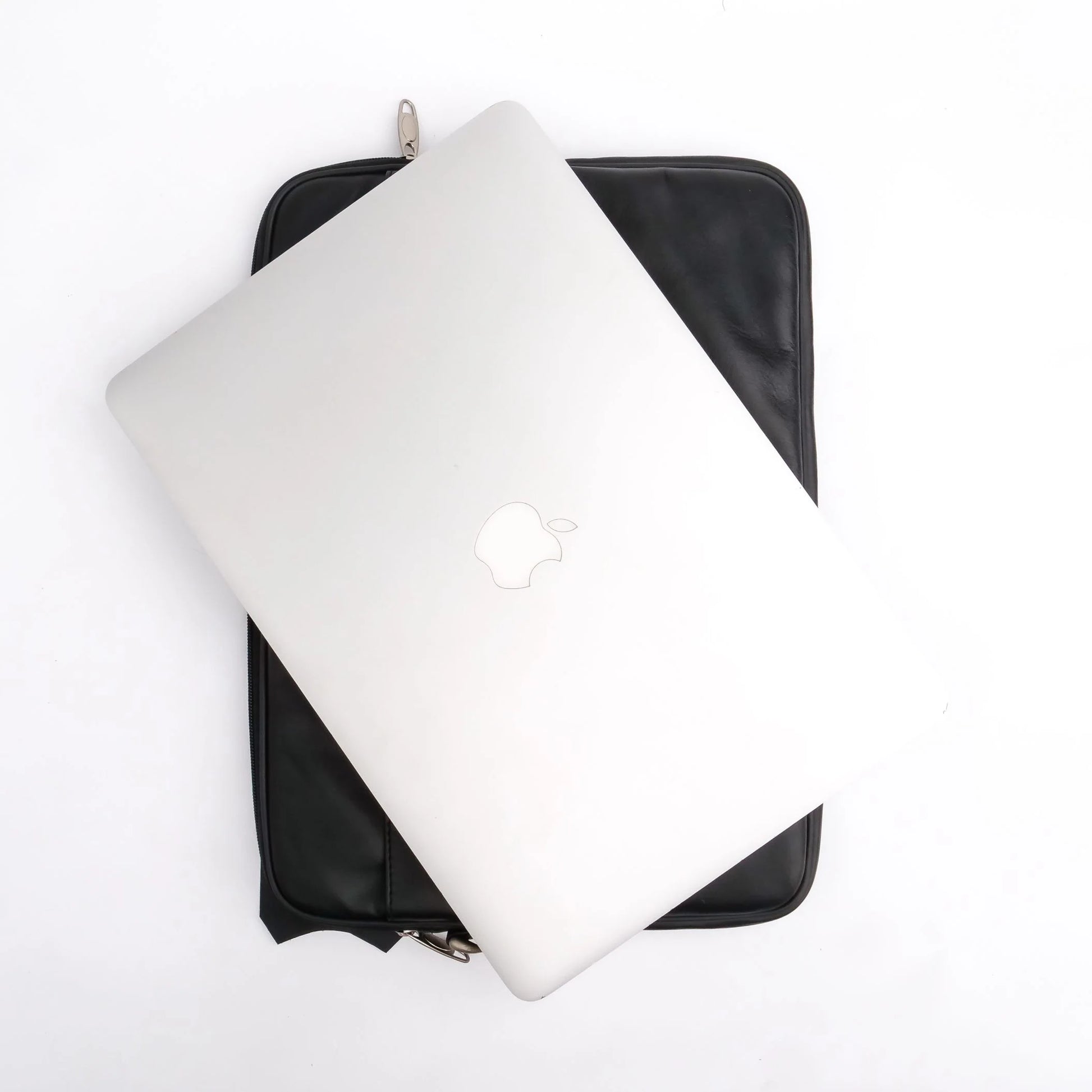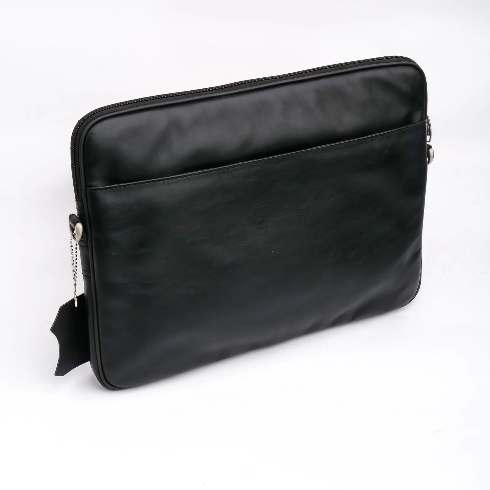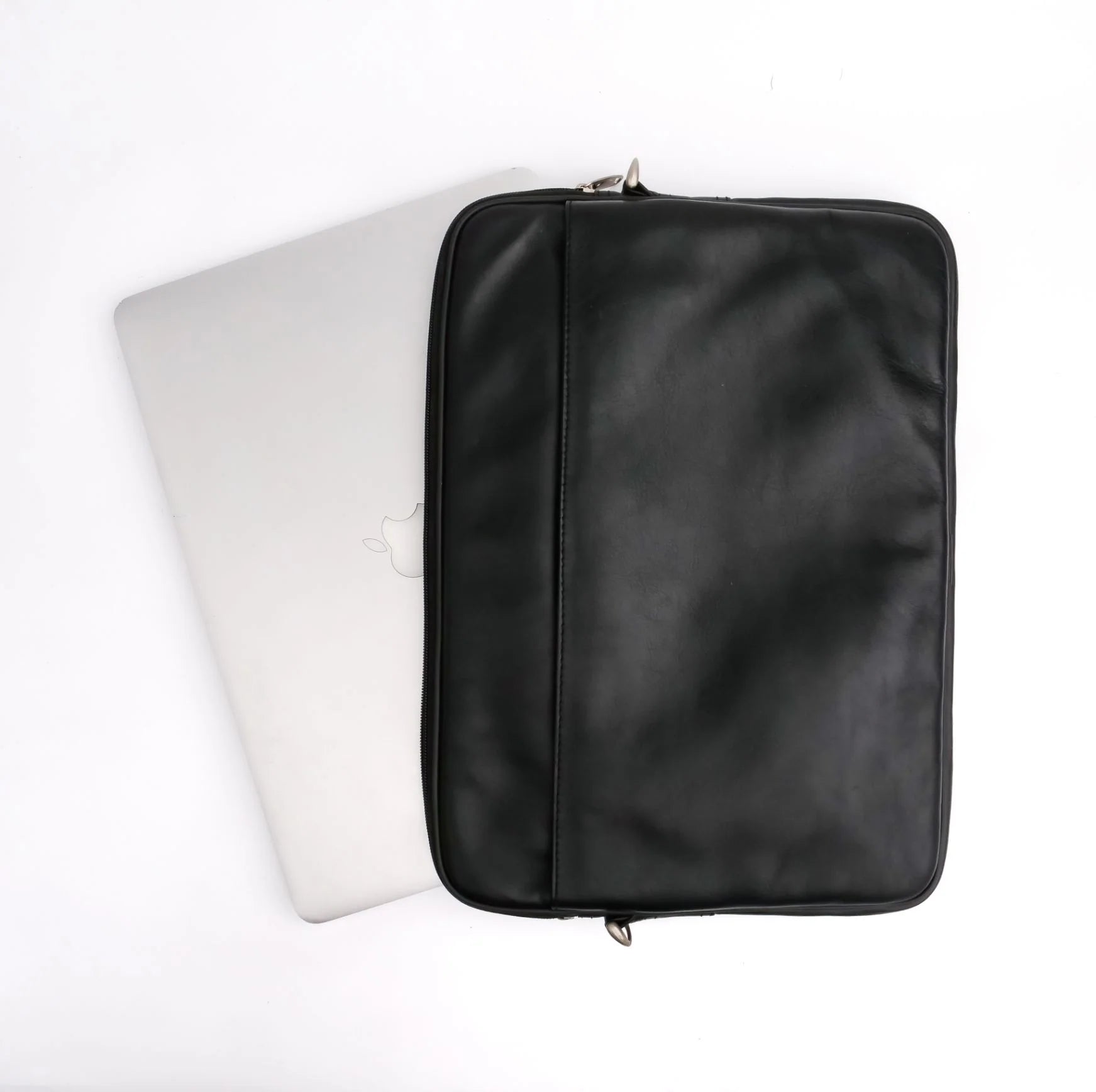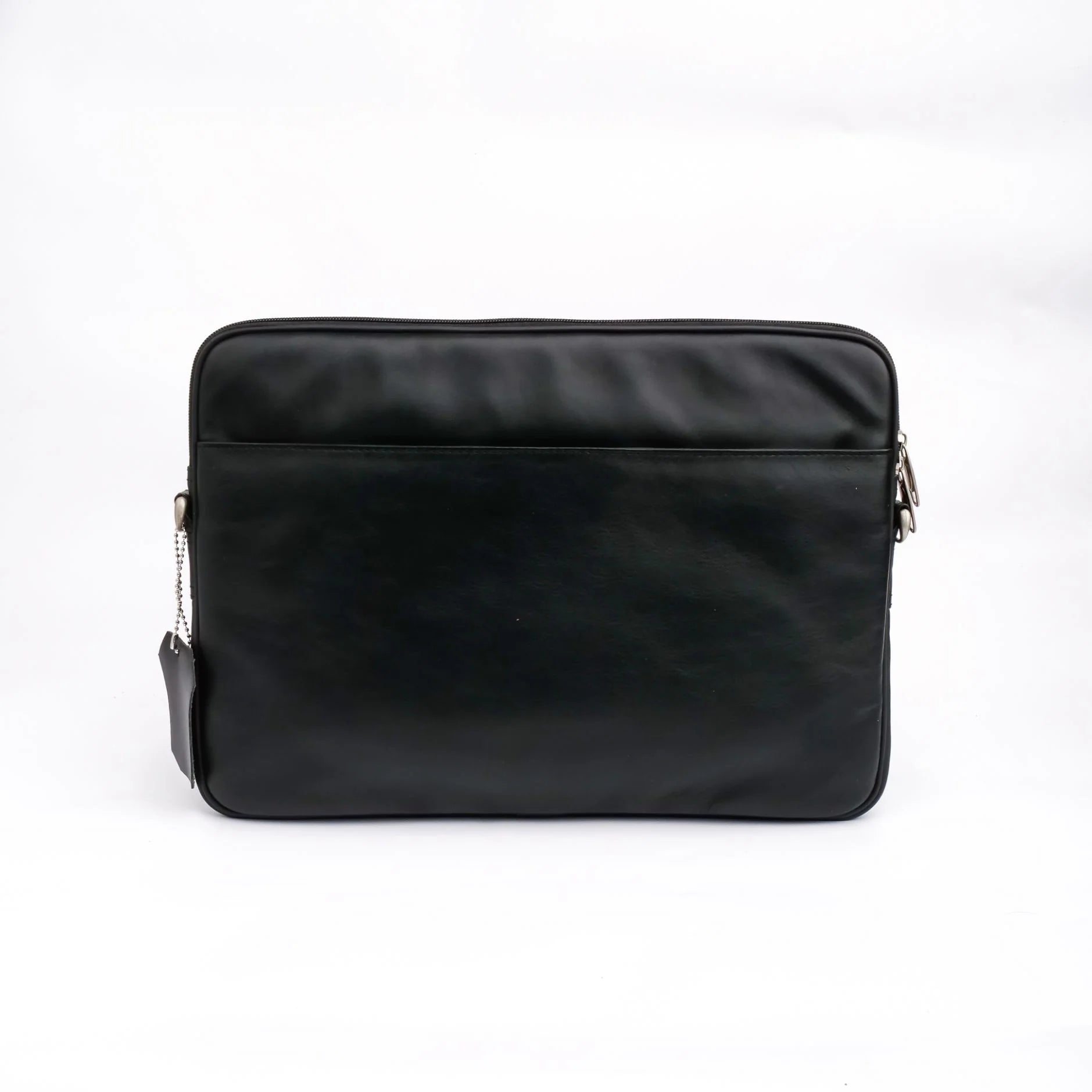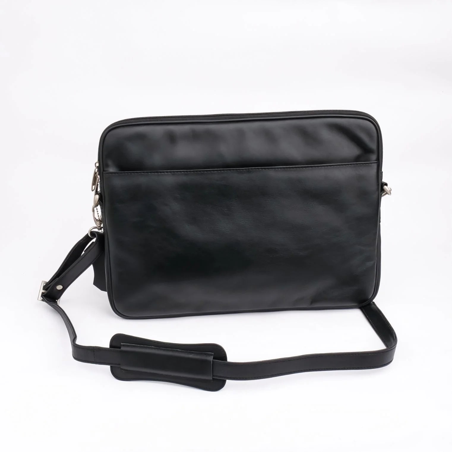 A classic black slim leather laptop bag designed for professionals who appreciate style, quality, and function.