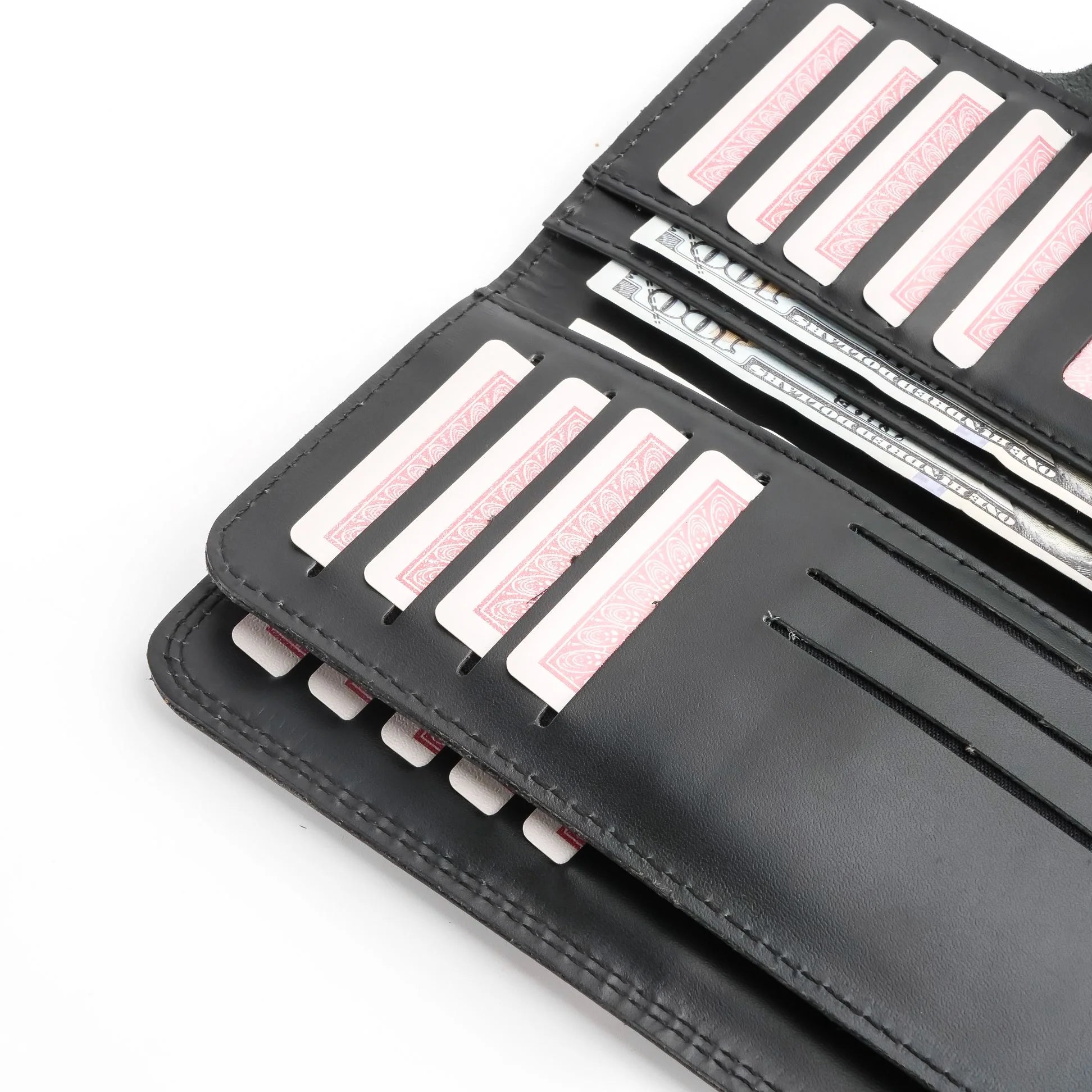 The smart tri-fold layout features 22 credit card slots, 6 spacious compartments for cash, mobile, or passport, and a dedicated ID card window, giving you ample space to organize everything you need. Its button closure ensures your belongings stay secure, while the compact and slim design makes it easy to carry in your pocket or bag.