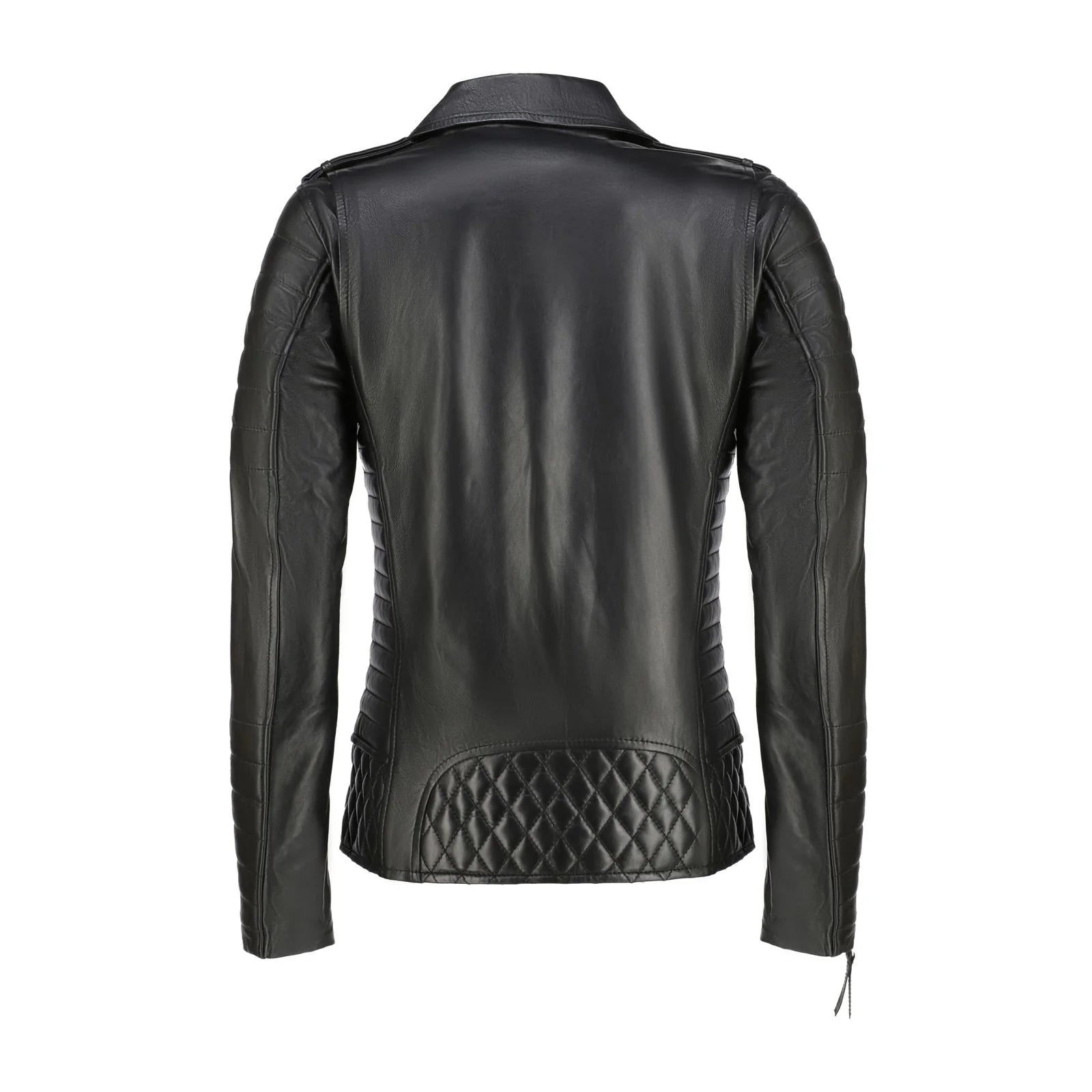 Take on the chilly season in style with this womens black quilted sleeve leather biker jacket, crafted from premium lambskin leather for a soft, luxurious feel. Featuring a zip-up front, quilted viscose lining, and zip-out lining, it’s lightweight, warm, and designed for comfort on the go.
